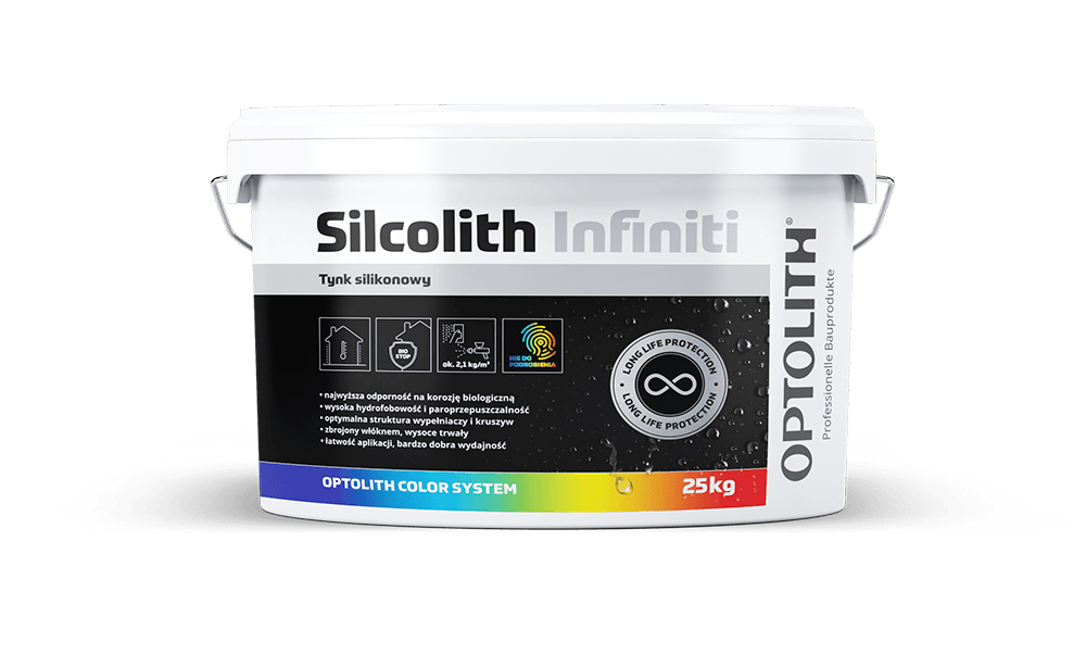 Silcolith Infiniti is a top-quality, thin-coat render for making a decorative and protective layer in the ETICS system (Optotherm Insulation Systems based on mineral wool or polystyrene). This product is a ready-to-use render – based on the silicone binder with specially selected mineral fillers, pigments, modifiers, and reinforcing fibres. The formulation and composition have been chosen to ensure maximum protection against overgrowth. It also provides a self-cleaning effect. In addition, it also ensures water-repellency, vapour permeability, ductility, durability, and resistance to environmental conditions.